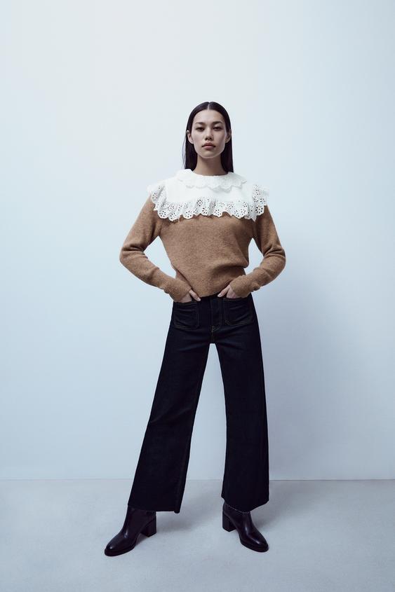 #Sweater | Sweater made of wool blend fabric. Round neck and long sleeves. Poplin appliqué with embroidered eyelet trim. Back opening with button closure.